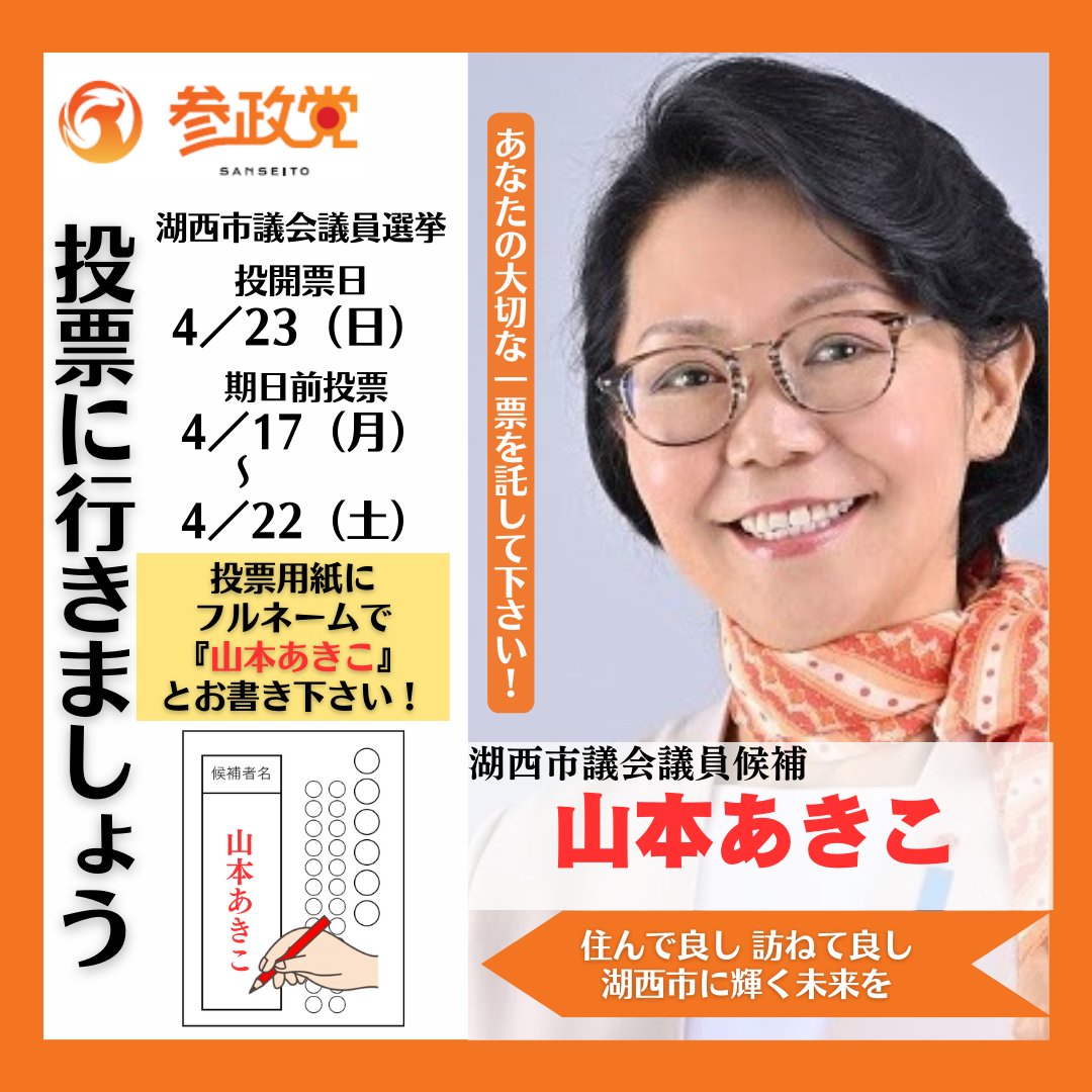 湖西市市議会議員選挙残すところ明日のみになりました。戦況は厳しい状況です。 どうか湖西市の市政に『#山本あきこ』を送り出してください。このバナーを使い、#湖西市 にお住まいのお知り合いにお声掛け頂けると有り難いです!皆様のあと一押し、ご支援...