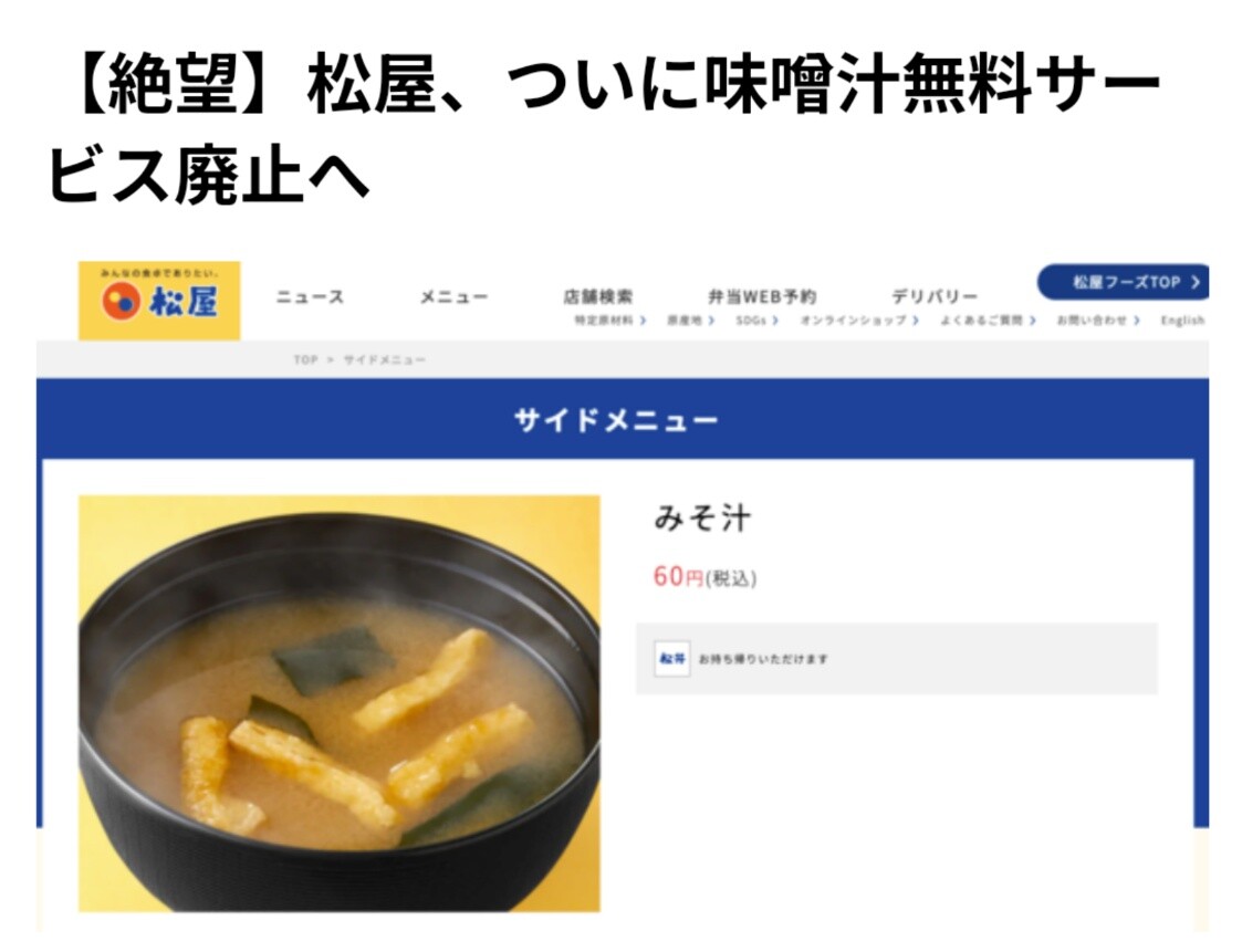 松屋の味噌汁がだんだん薄くなり、最後はお湯になったと 2024.02.03 松屋の味噌汁がだんだん薄くなり、最後はお湯になったと 続きを読む ——— Source: 銃とバッジは置いていけ 松屋の味噌汁がだんだん薄くなり、最後はお湯になったと
