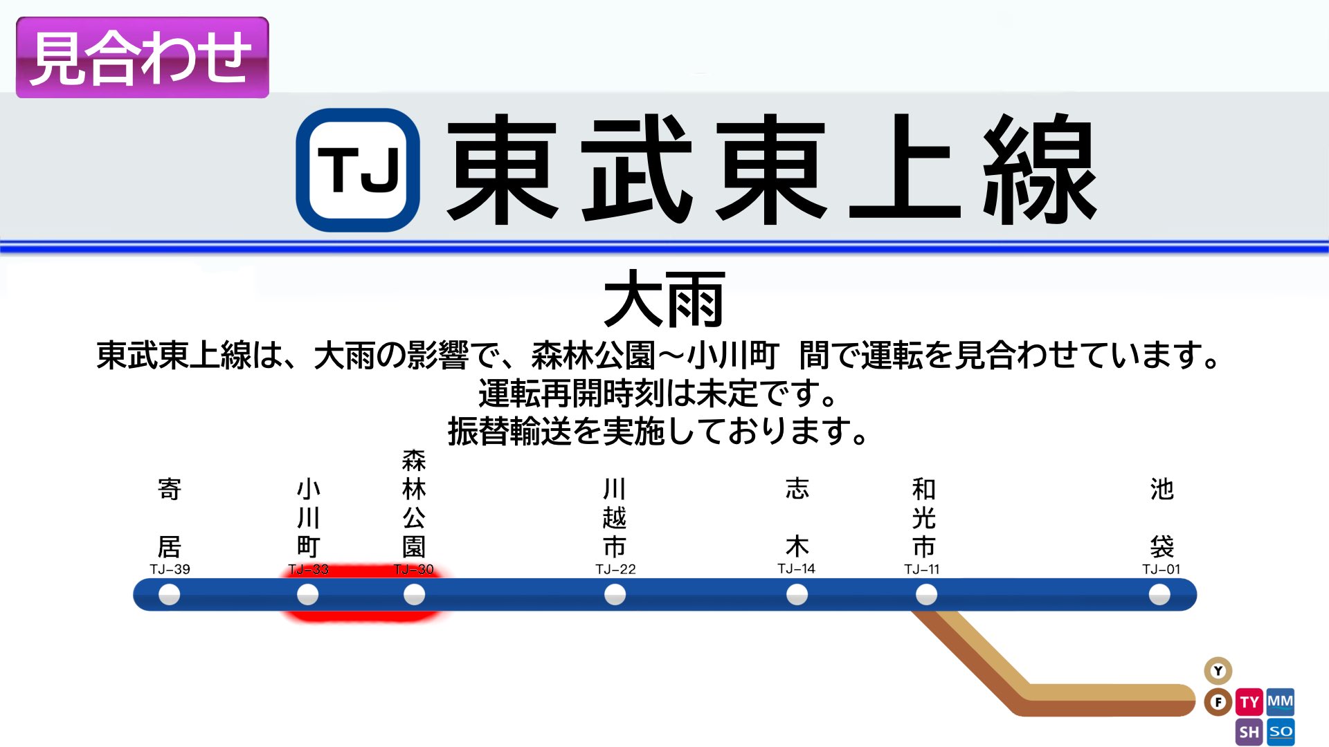 【運転見合わせ 東武東上線】東武東上線は、大雨の影響で、森林公園〜小川町 間で運転を見合わせています。運転再開時刻は未定です。振替輸送を実施しております。#運行情報 #運行状況 #東武鉄道 #東上線