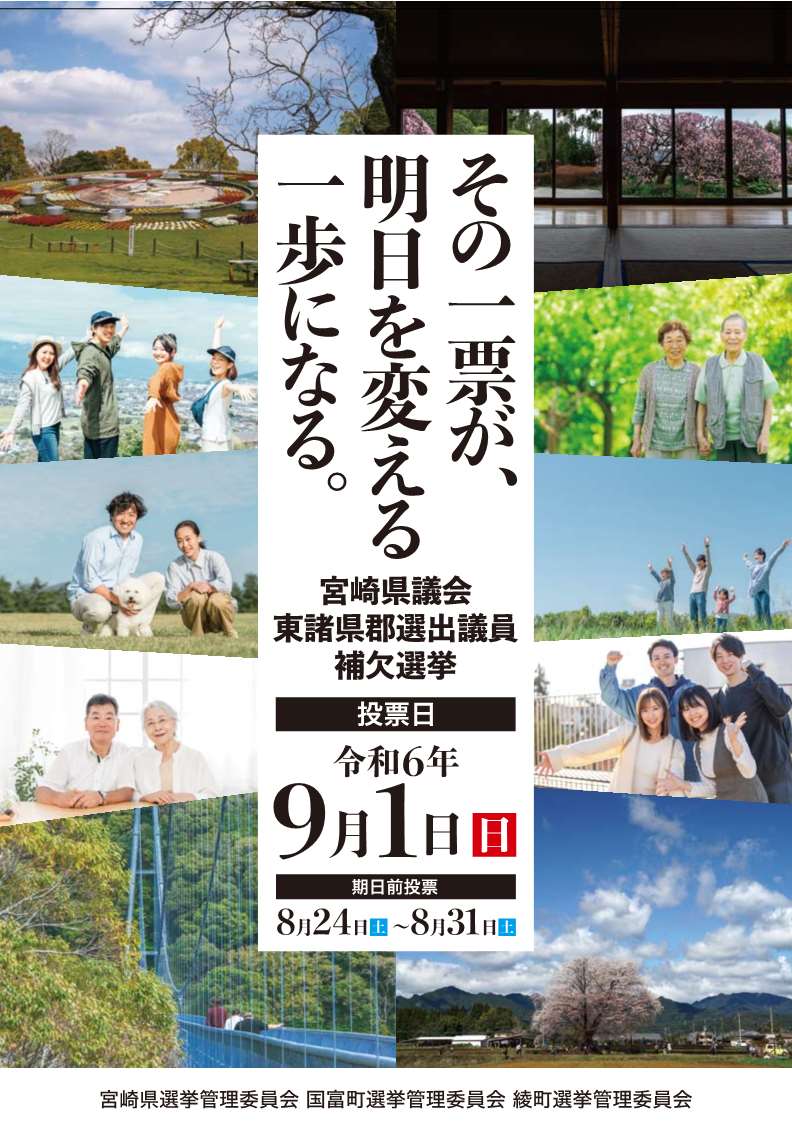 \9月1日は宮崎県議会議員補欠選挙の投票日!/県の課題と向き合う地域の代表者を決める大事な選挙です。国富町と綾町の皆さん、自分や家族、地域の明日のために、ぜひ、大切な一票を投じてください!詳しくはこちら↓