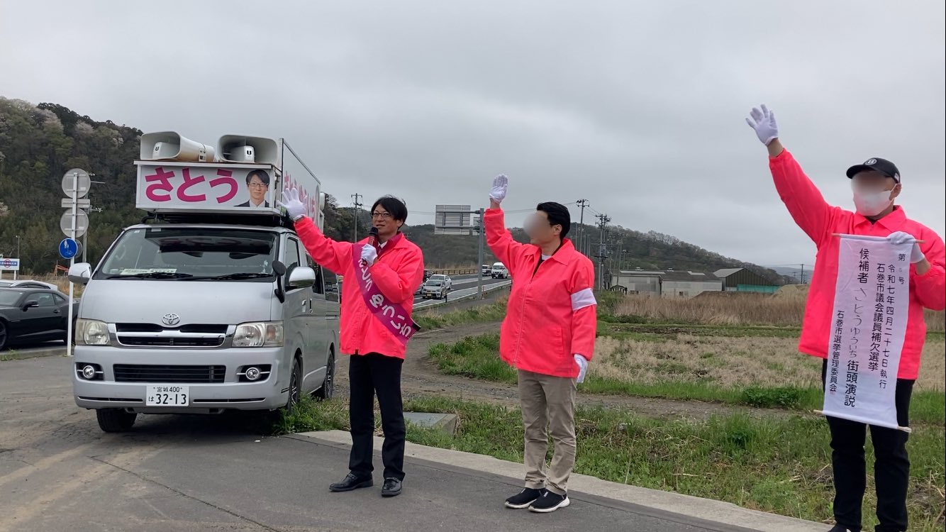 4/25(金)石巻市議補欠選挙6日目、石巻女川IC近くの交差点で朝のご挨拶からスタート📣本日は市内中心部と、雄勝地区をまわっております!