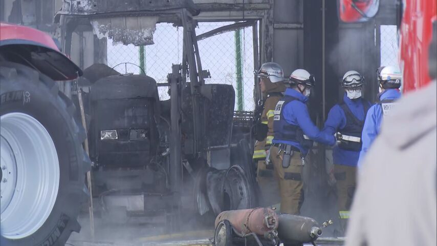 警察によりますと、倉庫内で暖房のためにストーブ使用していて、何らかの原因でストーブの火が建物や中に保管していたトラクターに燃え移ったものとみられています。