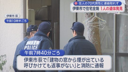静岡県伊東市で住宅1軒が全焼する火事があり、焼け跡から1人の遺体が発見されました。 4日午前7時40分ごろ、伊東市荻で「建物から煙が出ている。呼びかけても返事がない」と近所に住む人から消防に通