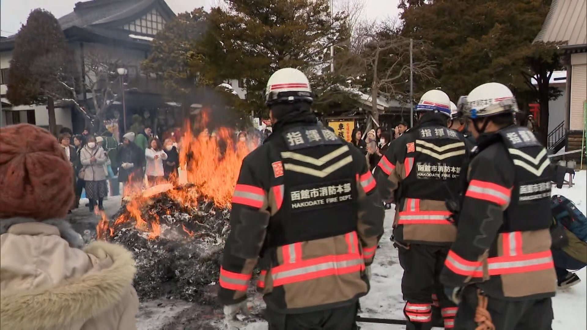 北海道・函館市で行われた無病息災を願う「どんど焼き」で、参拝者が転倒して火の中に突っ込み、やけどをしました。