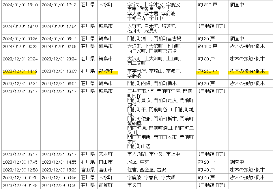 kakuyokusyugi (@kakuyokusyugi) on X北陸電力送配電のHPによると、2023年12月31日 14時12分に発生した停電の原因は「樹木の接触・倒木」だったと発表されています。ニュースが削除されたのは、おそらく「変電所」が原因ではなかったからだと思われます。— kakuyokusyugi (@kakuyokusyugi) January 1, 2024