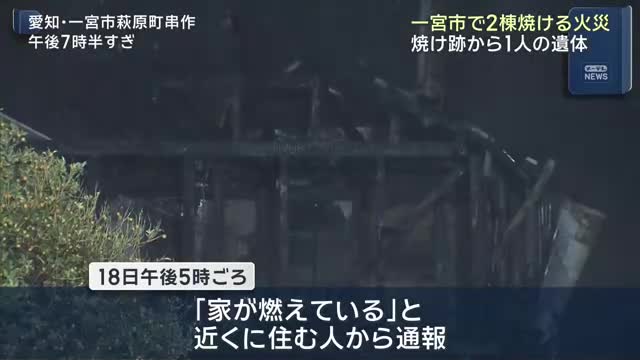 18日夕方、愛知県一宮市で住宅2棟が焼ける火事があり、焼け跡から性別と年齢のわからない1人の遺体が見つかりました。消防によりますと、18日午後5時ごろ、一宮市萩原町串作の住宅で、「家が燃えて